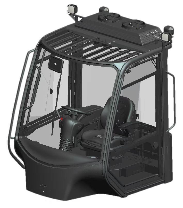 全景全浮駕駛室,視野好、操作空間大、駕駛室與車架柔性連接,有效隔絕振動(dòng)傳遞。
