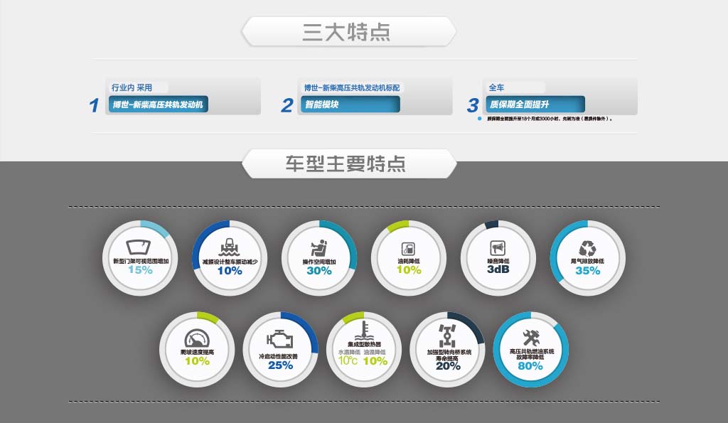 ●標(biāo)配博世-新柴高壓共軌電控發(fā)動(dòng)機(jī),采用高壓多次噴射技術(shù),動(dòng)力輸出強(qiáng)、煙度排放更低 、冷起動(dòng)性能更好;能耗節(jié)省。