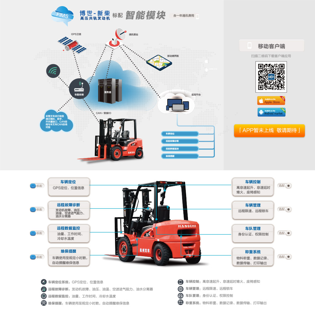 ● 云智能叉車(chē)管理系統(tǒng)是應(yīng)用先進(jìn)的物聯(lián)網(wǎng)和互聯(lián)網(wǎng)技術(shù),結(jié)合人工叉車(chē)實(shí)現(xiàn)車(chē)輛數(shù)據(jù)采集、車(chē)輛報(bào)警、車(chē)輛遠(yuǎn)程控制和診斷、車(chē)輛調(diào)度、物流跟蹤等功能,幫助用戶(hù)進(jìn)行車(chē)輛管理,智能調(diào)度和智能物流管控,提升企業(yè)設(shè)備管理和物流管理水平,叉車(chē)云智能終端可無(wú)縫對(duì)接云智能叉車(chē)管理系統(tǒng)。