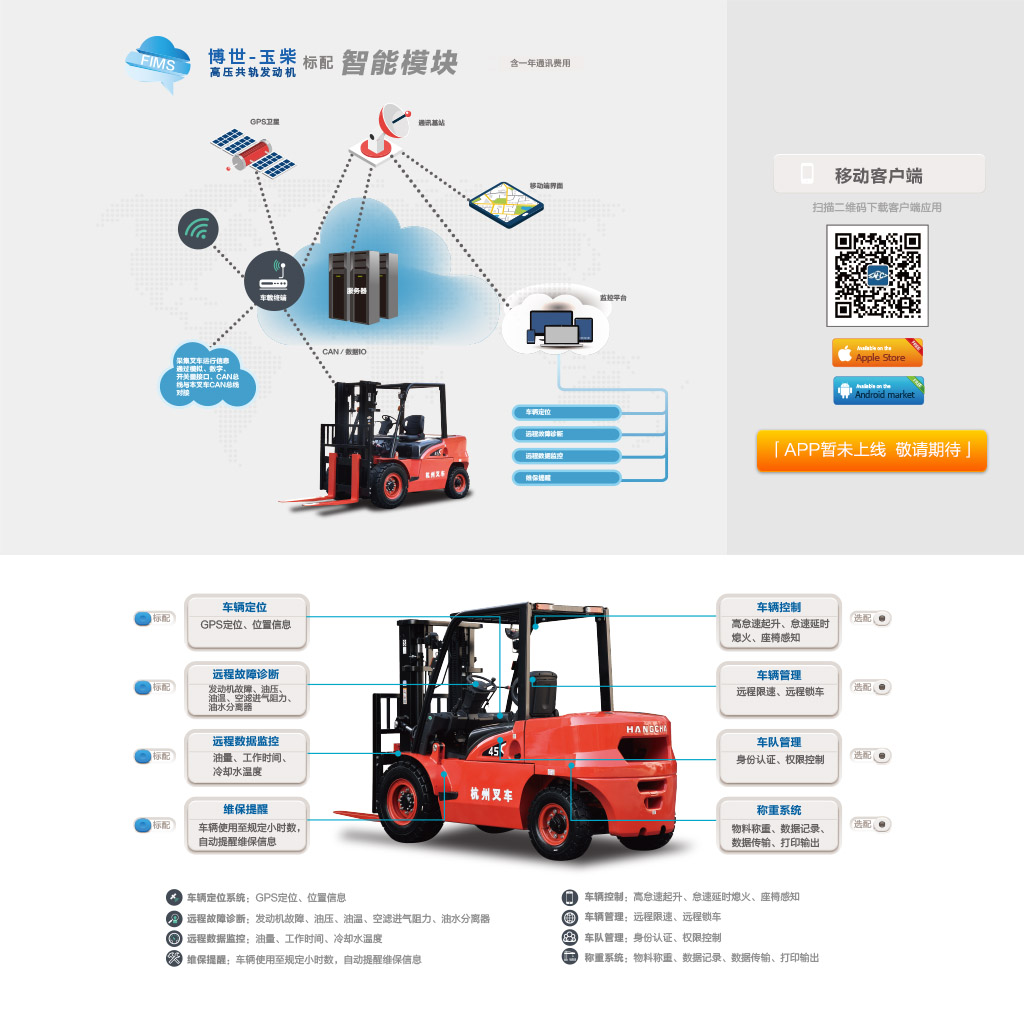 ● 云智能叉車管理系統是應用先進的物聯網和互聯網技術,結合人工叉車實現車輛數據采集、車輛報警、車輛遠程控制和診斷、車輛調度、物流跟蹤等功能,幫助用戶進行車輛管理,智能調度和智能物流管控,提升企業設備管理和物流管理水平,叉車云智能終端可無縫對接云智能叉車管理系統。